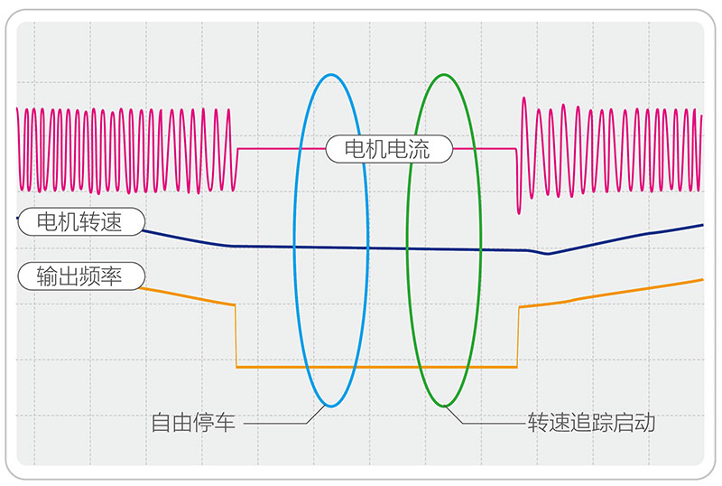 No need for dedicated hardware detection circuits; the inverter completes the identification of motor speed, direction, and phase angle within 0.2s, smoothly tracking the start of a freely rotating motor.