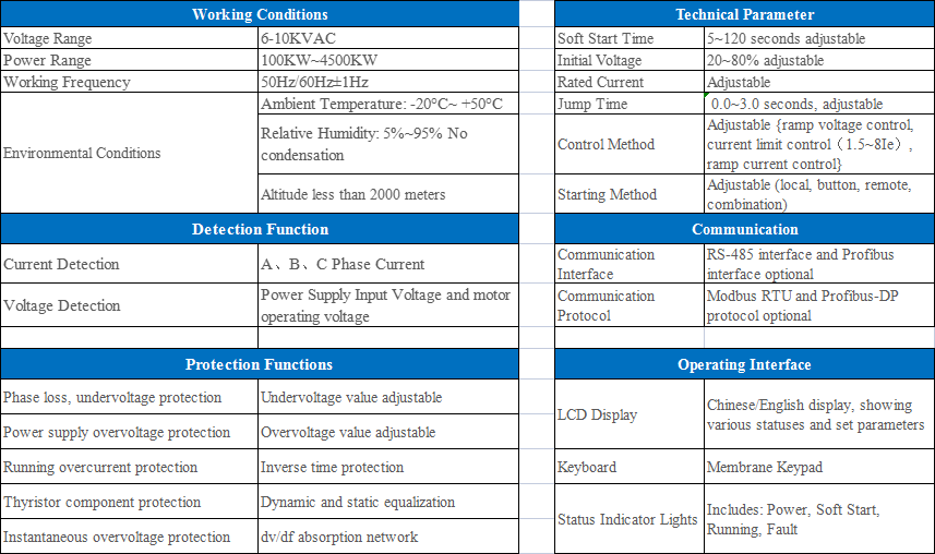 The GKGR series mining general medium voltage soft start control cabinet is widely used in industries such as coal mines, non-coal mines, power systems, machinery manufacturing, cement production, metallurgy, oil extraction, chemical engineering, and water treatment for AC asynchronous and synchronous motors. It is used for starting, controlling, protecting, and soft stopping three-phase voltage 6KV-10KV medium voltage motors.